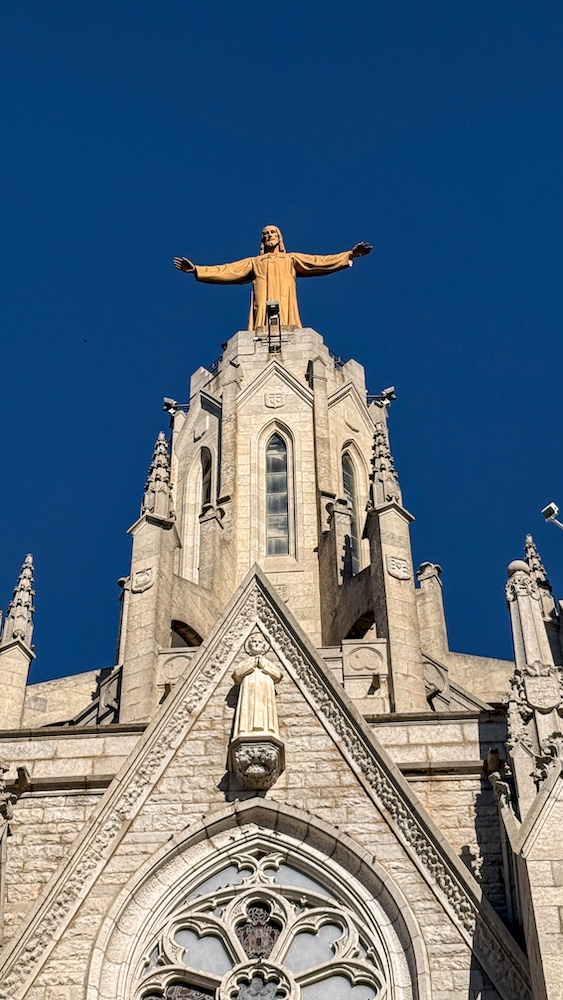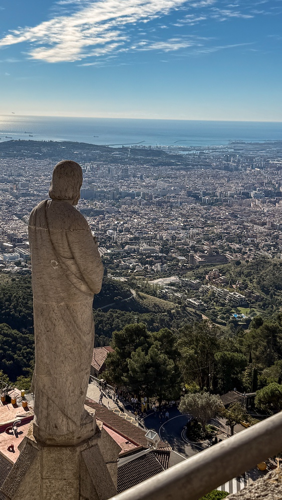 Miercuri, chiar de ziua mea, am sărbătorit la propriu în vârful Barcelonei, pe muntele Tibidabo, unde am petrecut jumătate de zi admirând Barcelona de sus. Drumul până aici a fost destul de lung, am ales să venim cu mijloace de transport în comun pentru a fi mai interactiv și pentru Noah. Am luat metroul până la Placa de Catalunya, apoi trenul până la Peu del Funicular. De aici am luat funicularul până la Vallvidrera. Apoi autobuzul încă 5 stații până la baza catedralei Sagrat Cor. După o asemenea aventură, bineînțeles că Noah a vrut să doarmă un pic așa că am profitat că am ajuns înaintea deschiderii parcului de distracții de aici și fiind încă liniște ne-am refugiat în biserică unde Noah a dormit vreo 2 ore în liniște deplină și acorduri subtile de orgă. Eu am profitat de ocazie și pentru 5 euro am urcat până în vârful absolut al catedralei, chiar sub statuia lui Iisus, la 564 m deasupra mării. De aici se vedeau excelent atât munții Pirinei, Montserrat și Montseny, cât și Barcelona și Marea Mediterană.