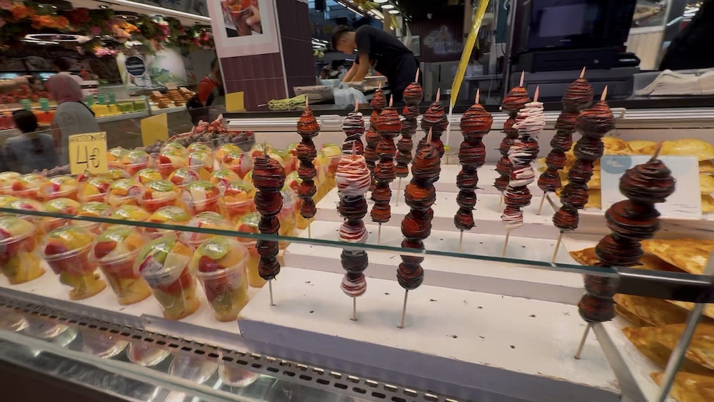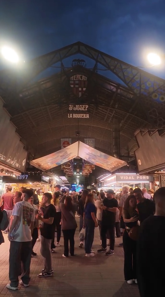 De la Bodega Biarritz am plecat către celebra piață Mercat de la Boqueria. Celebră atât pentru varietatea și prospețimea produselor vândute dar și pentru îmbulzeala de acolo. Pentru că aglomerația devenise deja puțin cam prea deranjantă pentru Noah, mai ales după o zi atât de încărcată, am luat câte un desert și l-am savurat undeva în afara pieței, pe băncuțele amenajate în aer liber. Ne-am bucurat și de razele soarelui și de vremea superbă și total diferită față de ce lăsasem în București.