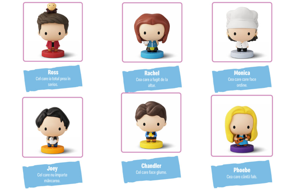 Fiecare pachet Friends Meal vine cu una dintre următoarele figurine inspirate din serial: