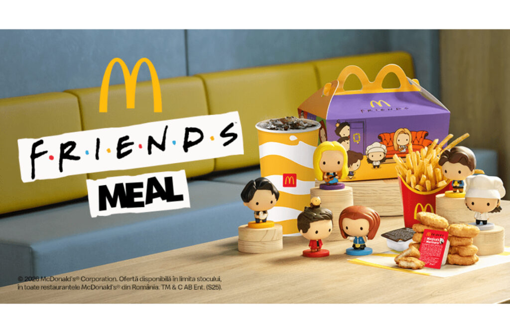 Începând de azi, McDonald’s aduce o surpriză specială fanilor serialului Friends: o colecție de figurine tematice inspirate din personajele cult ale sitcomului, disponibile pentru o perioadă limitată în meniurile selectate Friends Meal.