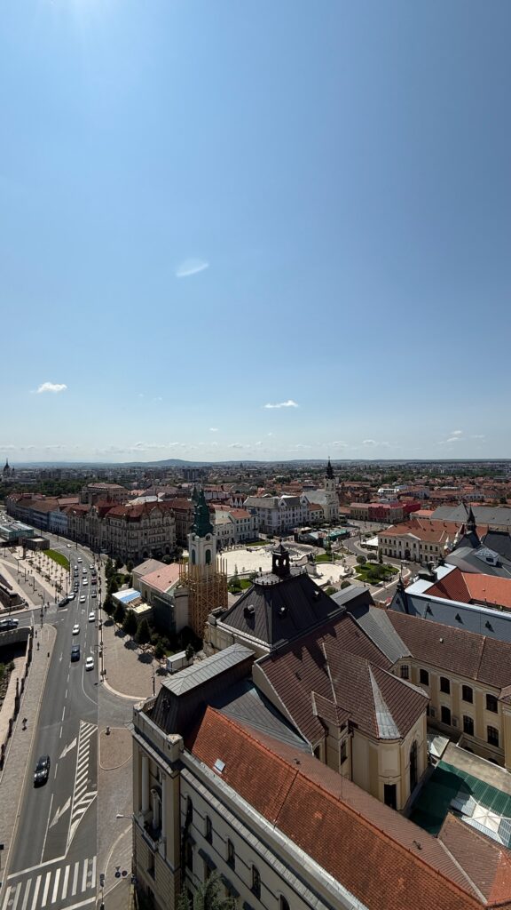 A 3-a și ultima noastră zi în Oradea a început cu deja tradiționalul mic dejun de la Meron dar și cu o vizita solo în turnul Primăriei pentru o priveliște panoramică de 360 de grade asupra orașului. Priveliștea a meritat fiecare pas. Am urcat doar eu pentru că Noah era puțin mârâit și oricum nu ar fi fost foarte indicat având în vedere că ieșirea în balcon se face printr-un geam termopan destul de greu de manevrat cu un copil în brațe.